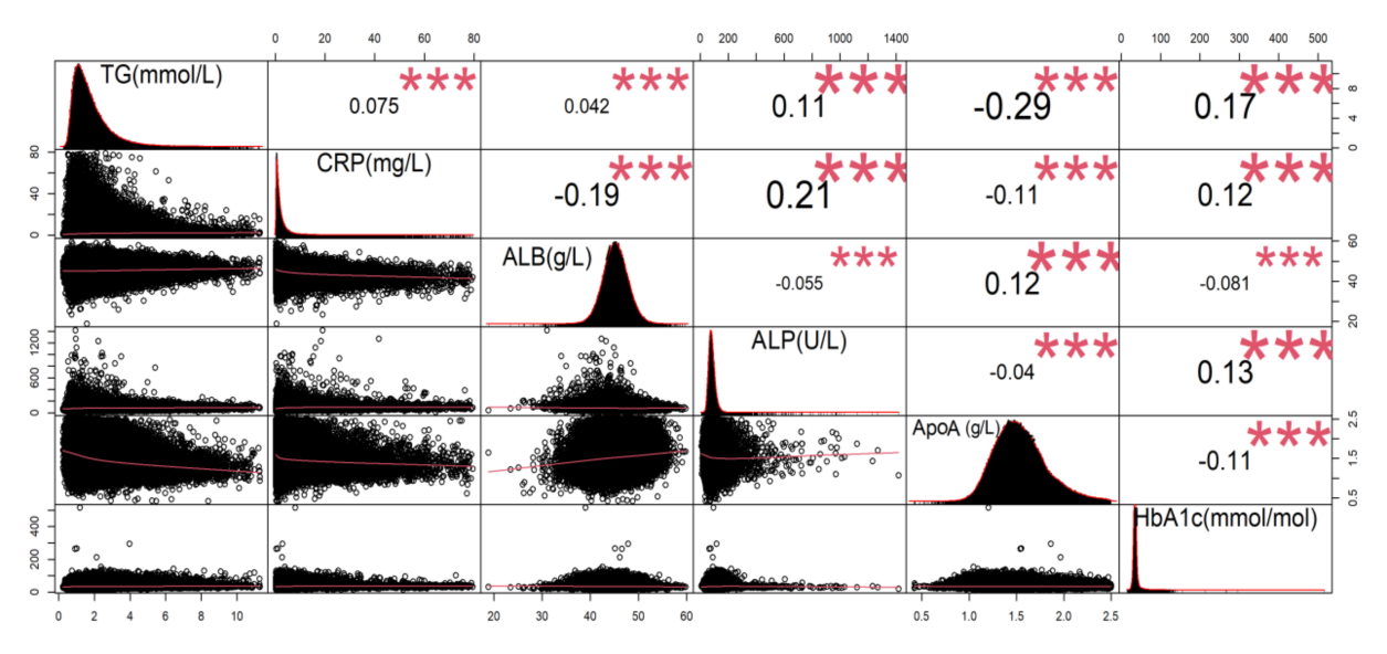 Notes: TG: Triglyceride; CRP: C-reaction protein; ALB: Albumin; ALP: Alkaline phosphatase; APOA1: Apolipoprotein A1; HbA1c: Glycosylated hemoglobin.