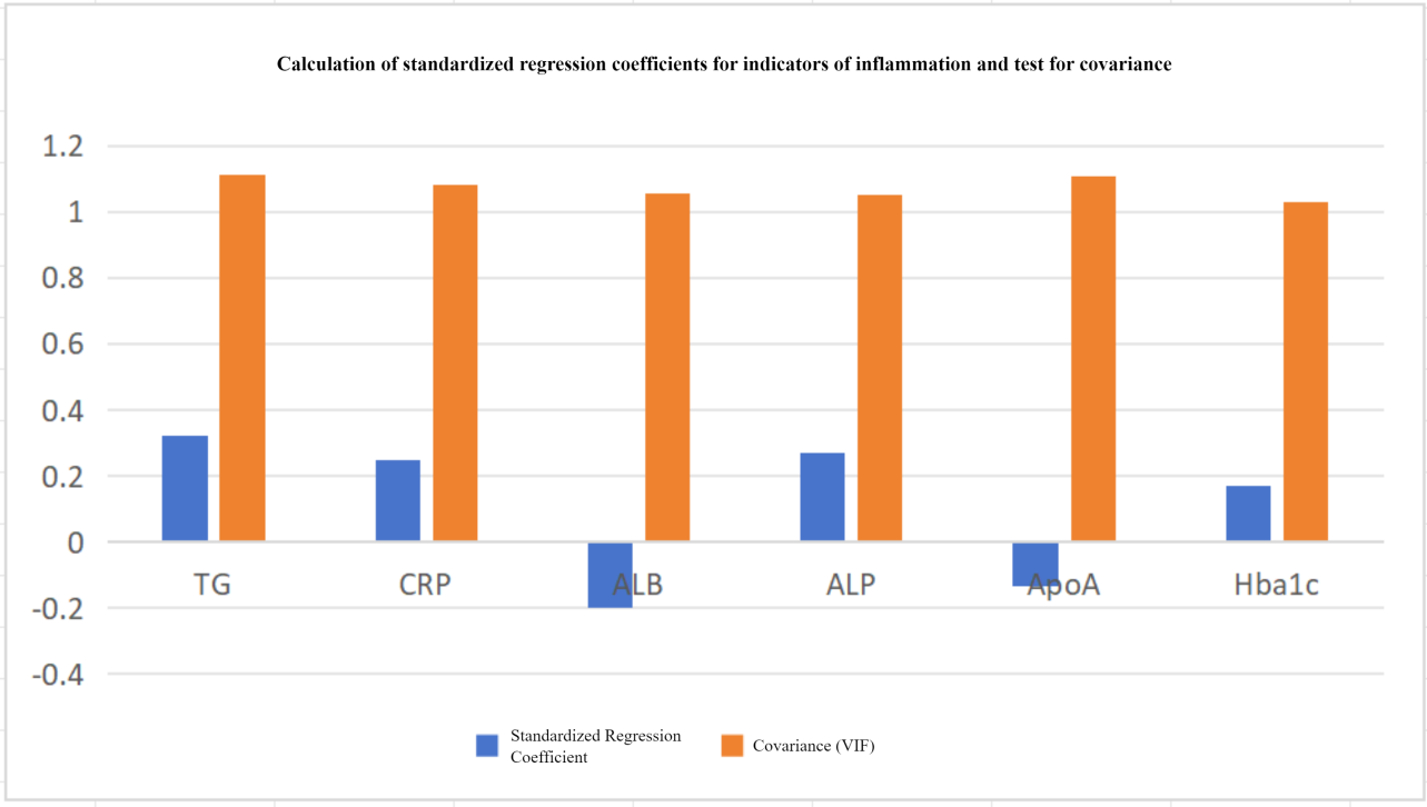 In order to verify the reliability of the regression model, we performed correlation analysis and covariance tests on the independent variables. Correlation analyses showed that the correlation coefficients between the independent variables were much less than 1, which suggested that there is no high correlation between the six inflammation indicators (Figure 1). Then, we carried out the covariance test and the Variance Inflation Factor (VIF) values were all around 1, much less than 10, suggested that the effect of covariance between independent variables can be excluded. And we calculated standard regression coefficients for inflammation indicators, in which TG had the largest standard regression coefficient (0.321), which indicates that the effect of TG on the coexistence of multiple diseases is the largest, followed by ALP (as shown in Figure 2).