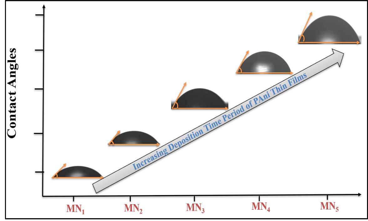 To study the wettability nature of the prepared PANI films, contact angle measurement was conducted for all samples (Figure 4). In this process, a liquid electrolyte drop was kept on the sample surface, and a contact angle meter was used to photograph the interaction of the liquid with the sample surface.