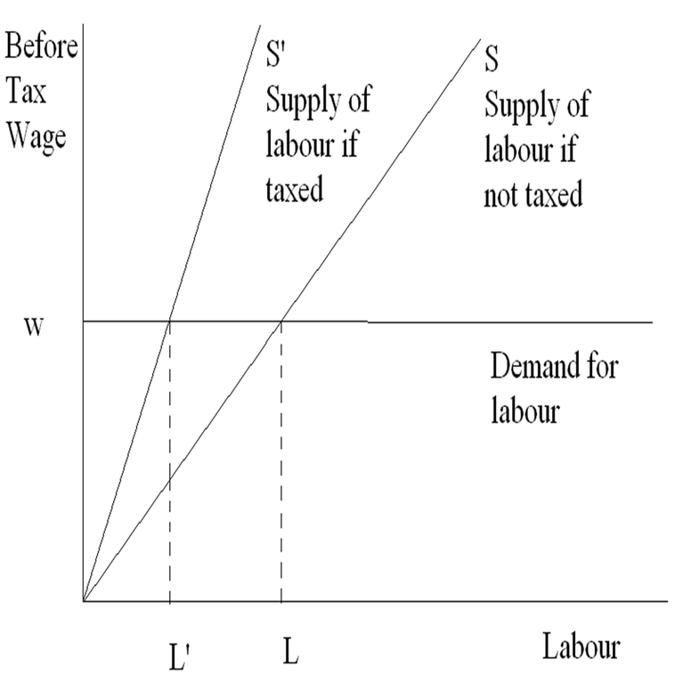 If labor is taxed at a rate of x, the worker will receive a wage of w=(1-x)w, where w is the amount paid by the firm. Due to the imposition of this tax, the supply curve shifts leftward, moving the equilibrium to the left. The tax revenue collected by the government is given by Equation (35).