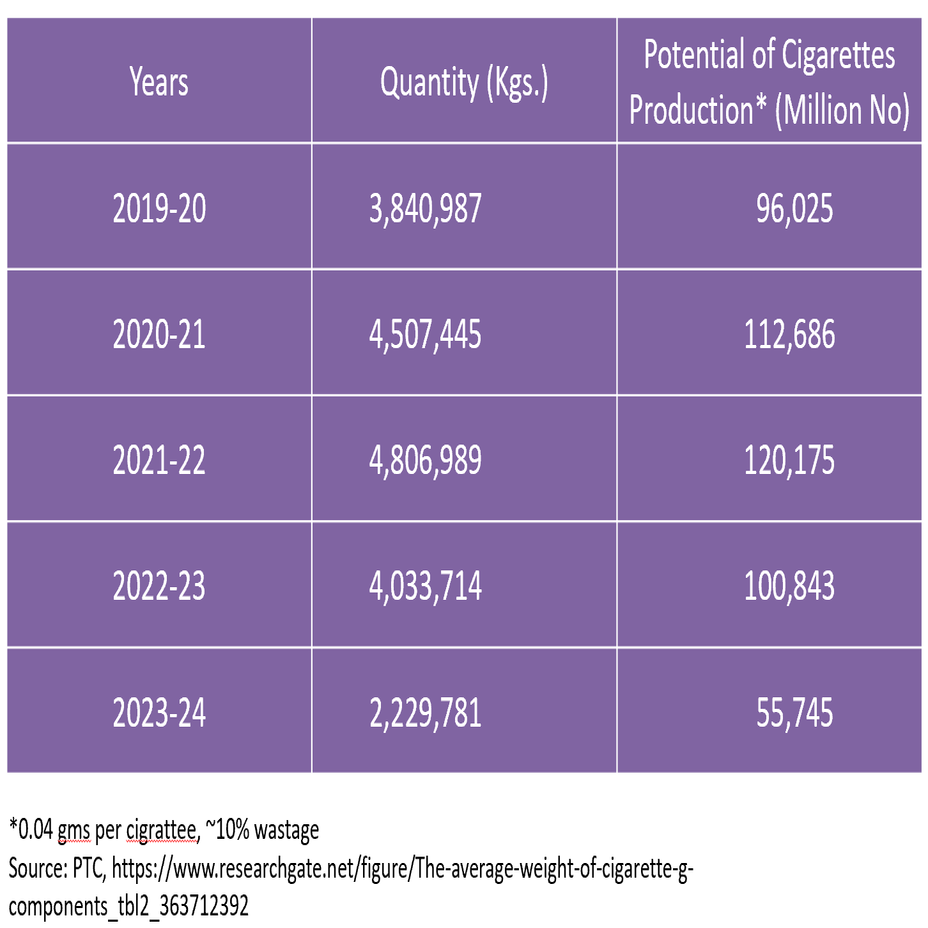 There is a huge tax revenue leakage in cigarette industry in Pakistan as about two-thirds of the cigarette market is composed of illicit brands due to higher demand for cheaper cigarettes on account of affordability. Domestic market share of high end brands has drastically declined, i.e., 48 billion sticks in 2021-2022 to 26.8 billion in 2023-2024 according to the VAT returns data of the federal board of revenue. PTC and philip morris are contributing over 97% of the tax revenue from cigarette industry.
