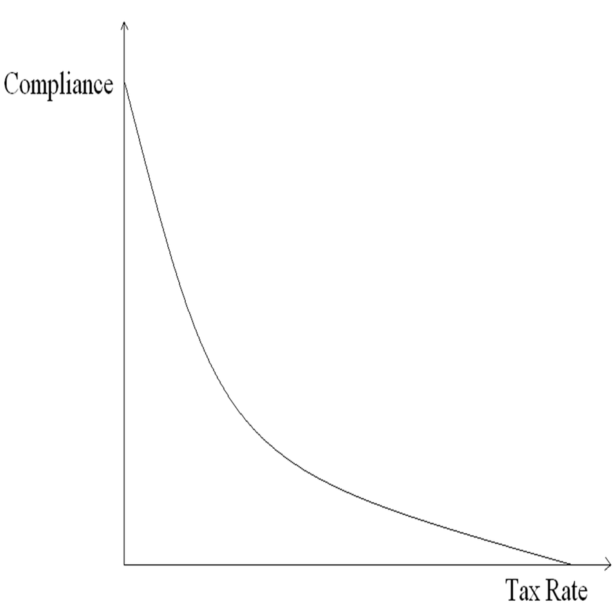 Fractional compliance ranges from zero to one, meaning it equals one at a zero percent tax rate. Conversely, at a one hundred percent tax rate, compliance drops to zero, as it is unreasonable to expect individuals to give up all their consumption / earnings without retaining anything for their own needs. Therefore, it is evident that tax revenue will be zero at both zero and one hundred percent tax rates. In other words: